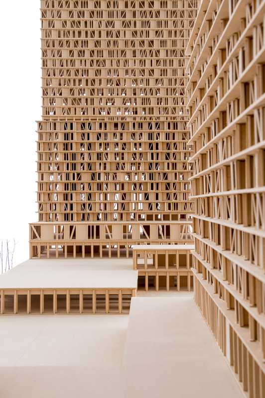 The project, a contribution to the American Pavilion of the 2016 Venice Biennial, speculates on a renewal of the entire district of Corktown in Detroit as a high-density environment built with mass timber. Conceived as a time based protocol instead of a traditional master plan, the project integrates the cycles of construction and obsolescence with those of nature and agriculture into a holistic system that becomes a total environment and a proposal for how cities could work in the future. It is widely acknowledged that per capita energy consumption in the U.S. must be cut by 75 percent in order to keep the worst effects of global warming in check. We believe that the only way to achieve such drastic reductions is through urban development built to densities that support mass transit. Predicated on an imminent carbon market, New Corktown exploits its most valuable resource—its existing urban footprint and current excess of available land—to become a new model for the integration of open space and high-density construction.